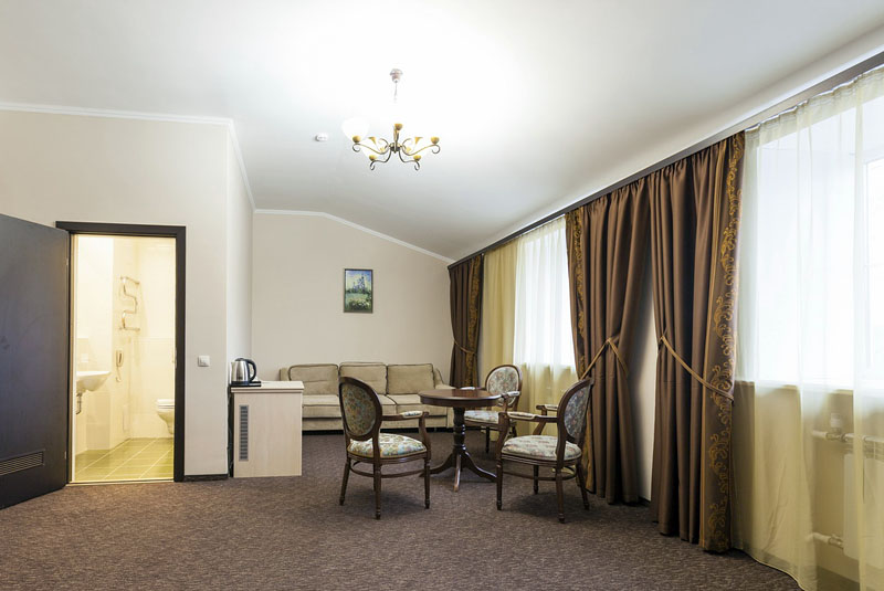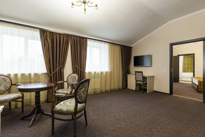 Двухкомнатный номер с двумя санузлами. Оформлен в классическом стиле.