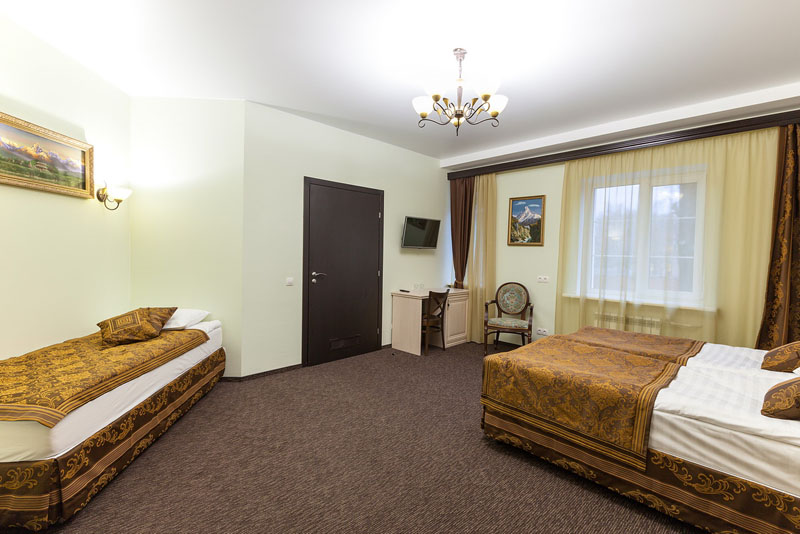 В номере три односпальные кровати (90 см.) с ортопедическим матрасом, 2 тумбочки, шкаф. А также: письменный стол, стул, ТВ – жк, вешалка/зеркало, багажная тумба.